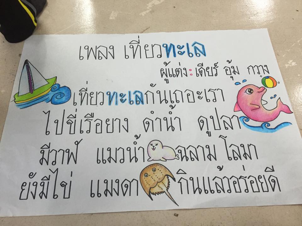 เมื่อกลุ่มของฉันช่วยกันแต่งเพลงเสร็จแล้ว ฉันก็นำเนื้อเพลงมาเขียนลงในกระดาษแผ่นใหญ่
